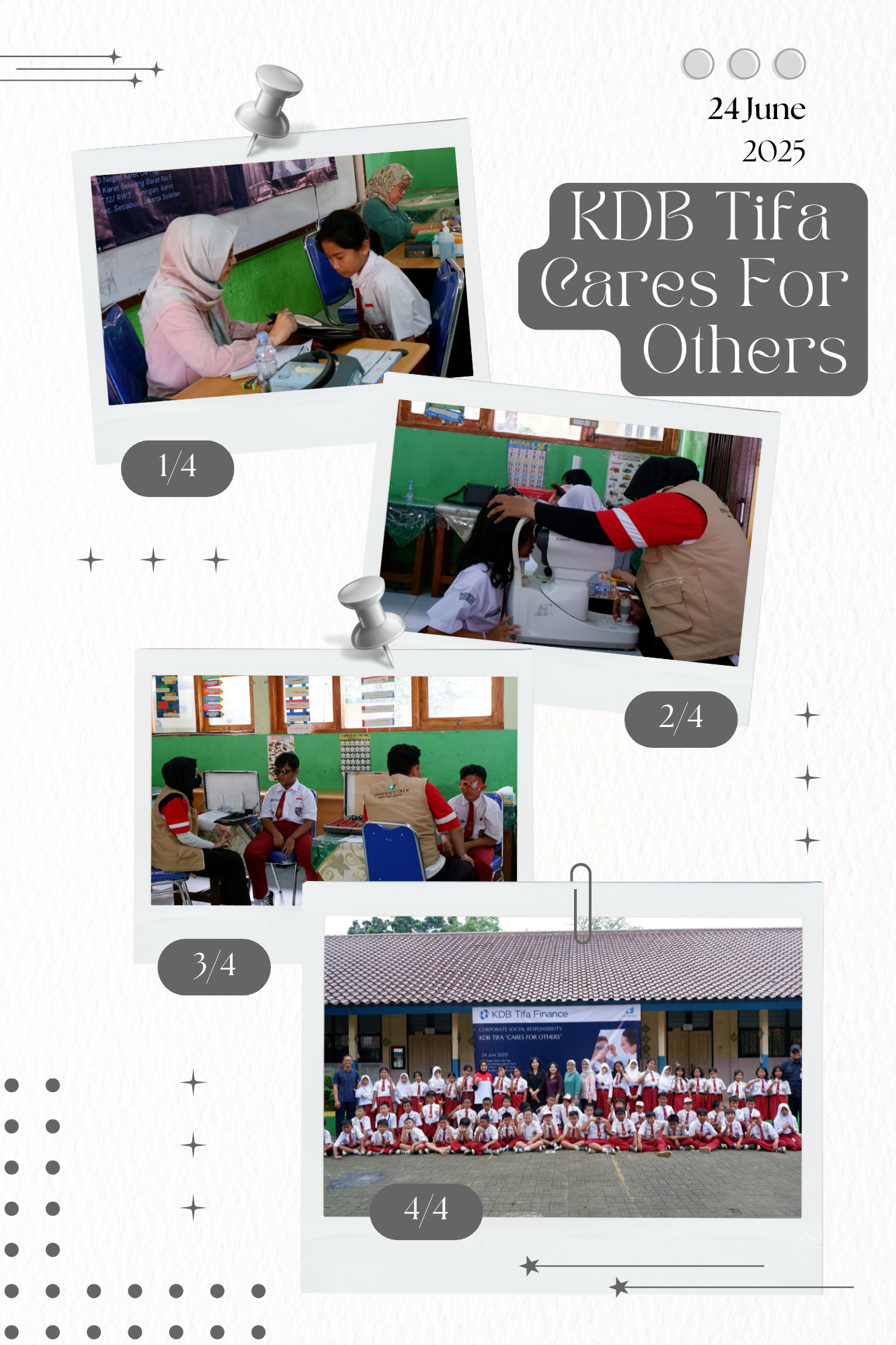 Sebagai bentuk tanggung jawab PT KDB Tifa Finance Tbk (“Perseroan”), Perseroan kembali menyelenggarakan kegiatan Tanggung Jawab Sosial Perusahaan yang merupakan program berkelanjutan bertemakan “KDB Tifa Cares For Others” pada tanggal 24 Juni 2025. Pada tahun 2025, Perseroan kembali bekerja sama dengan Rumah Sakit Jakarta untuk memberikan pemeriksaan mata gratis (autoreff, refraksi, buta warna) serta konsultasi dengan dokter spesialis mata kepada 116 siswa-siswi di SD Negeri Karet 04 Pagi. Kegiatan ini disambut dengan antusias oleh siswa-siswi, guru, dan orang tua murid terkait. Tujuan dari kegiatan ini adalah untuk meningkatkan kesadaran siswa-siwi akan kesehatan mata sejak dini dengan harapan para siswa-siswi dapat menjaga kesehatan matanya dengan lebih baik. Kegiatan Tanggung Jawab Sosial Perusahaan merupakan salah satu bentuk kepedulian Perseroan terhadap lingkungan sekitar baik dari aspek sosial, ekonomi, dan lingkungan.