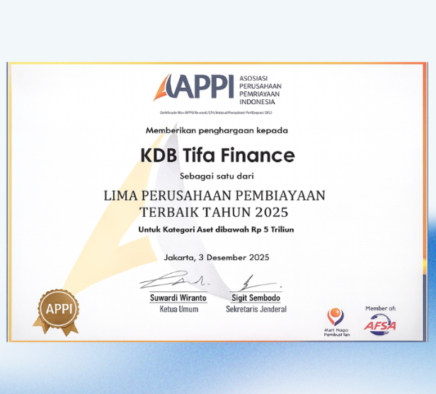 PT KDB Tifa Finance Tbk (“Perseroan”) meraih penghargaan sebagai salah satu dari Lima Perusahaan Pembiayaan Terbaik Tahun 2025 untuk kategori Aset di bawah Rp 5 Triliun dari Asosiasi Perusahaan Pembiayaan Indonesia (APPI). Penghargaan bergengsi ini diberikan pada Rabu (3/12/2025) di The Raffles Hotel, Jakarta sebagai bentuk apresiasi APPI kepada perusahaan pembiayaan yang mampu menunjukkan kinerja unggul dan tata kelola yang solid di tengah dinamika industri.